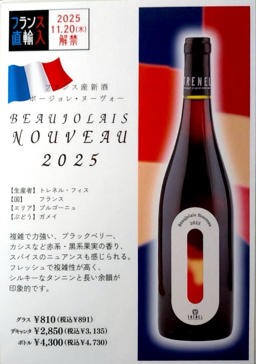 11月20日より、フランス産新酒『ボージョレ・ヌーヴォー』を解禁しております!